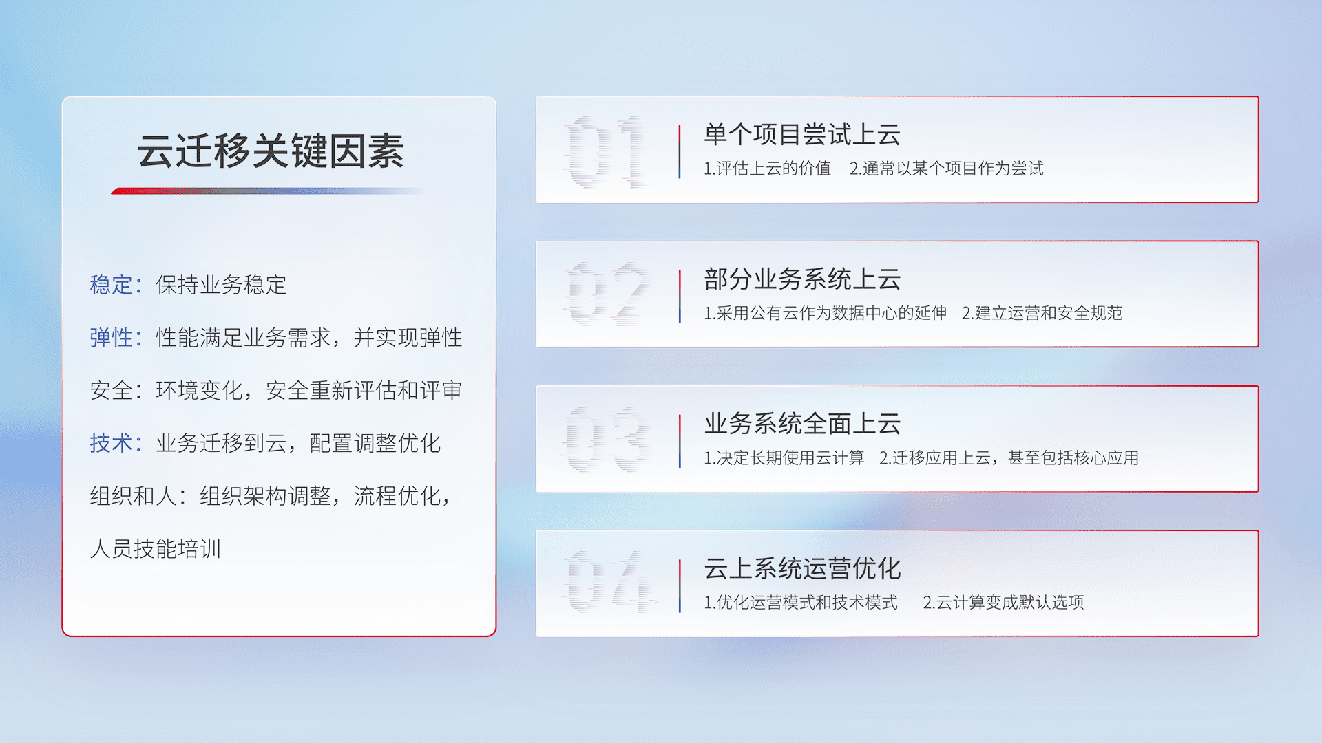 结合实际业务,,,从规划设计、、、、云平台选型、、云原生改造、、数据迁移、、集成交付,,,迁移全过程为客户识别最佳上云路径,,做好风险识别管理,,设计网络架构、、、身份权限、、安全审计合规、、、操作审计、、、日志审计、、、监控告警策略、、、、多站点容灾设计等,,,对云上基础设施进行整体规划,,,提升IT治理水平,,,,以满足弹性、、高可用、、高性能的需求。。。。