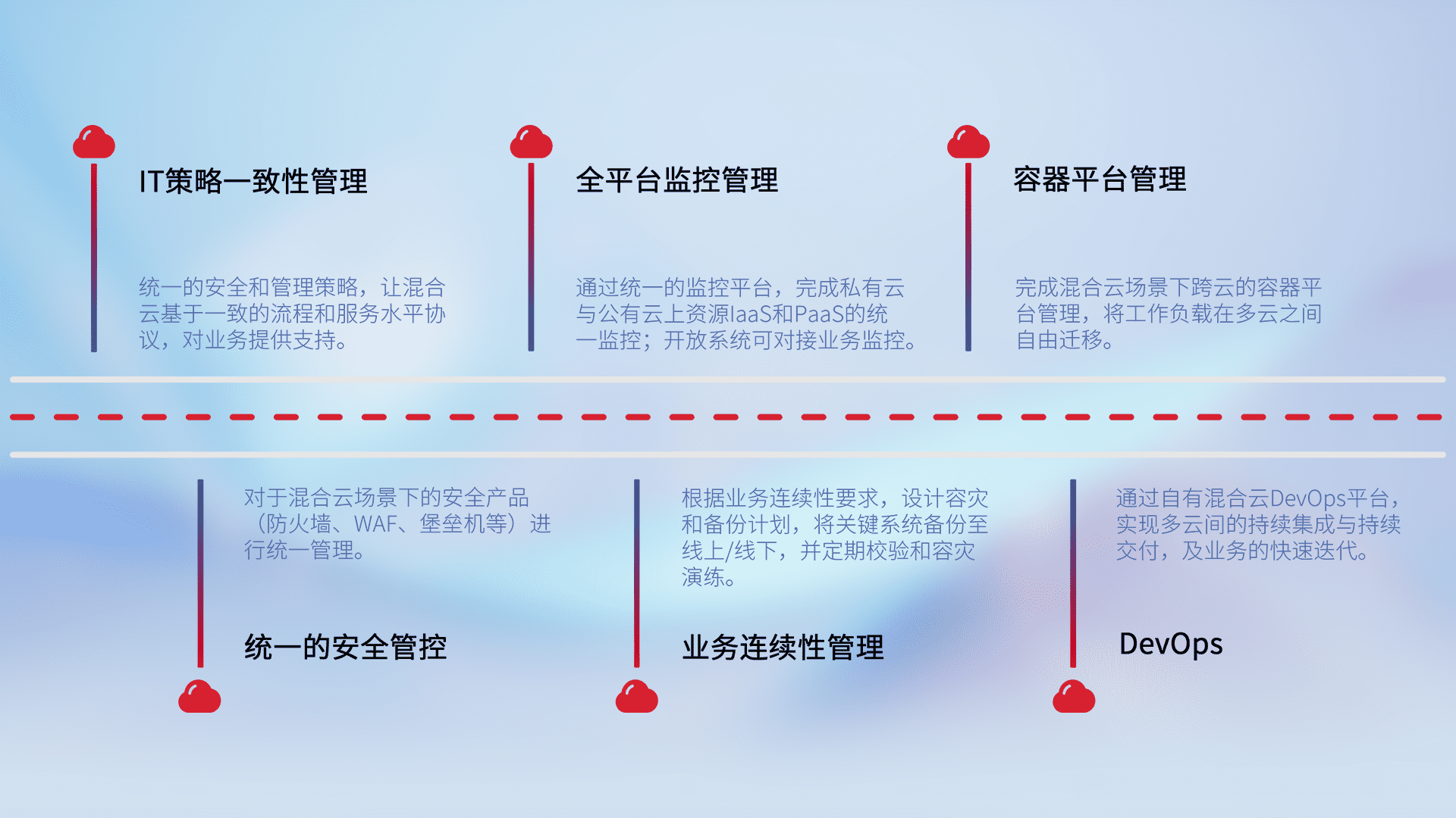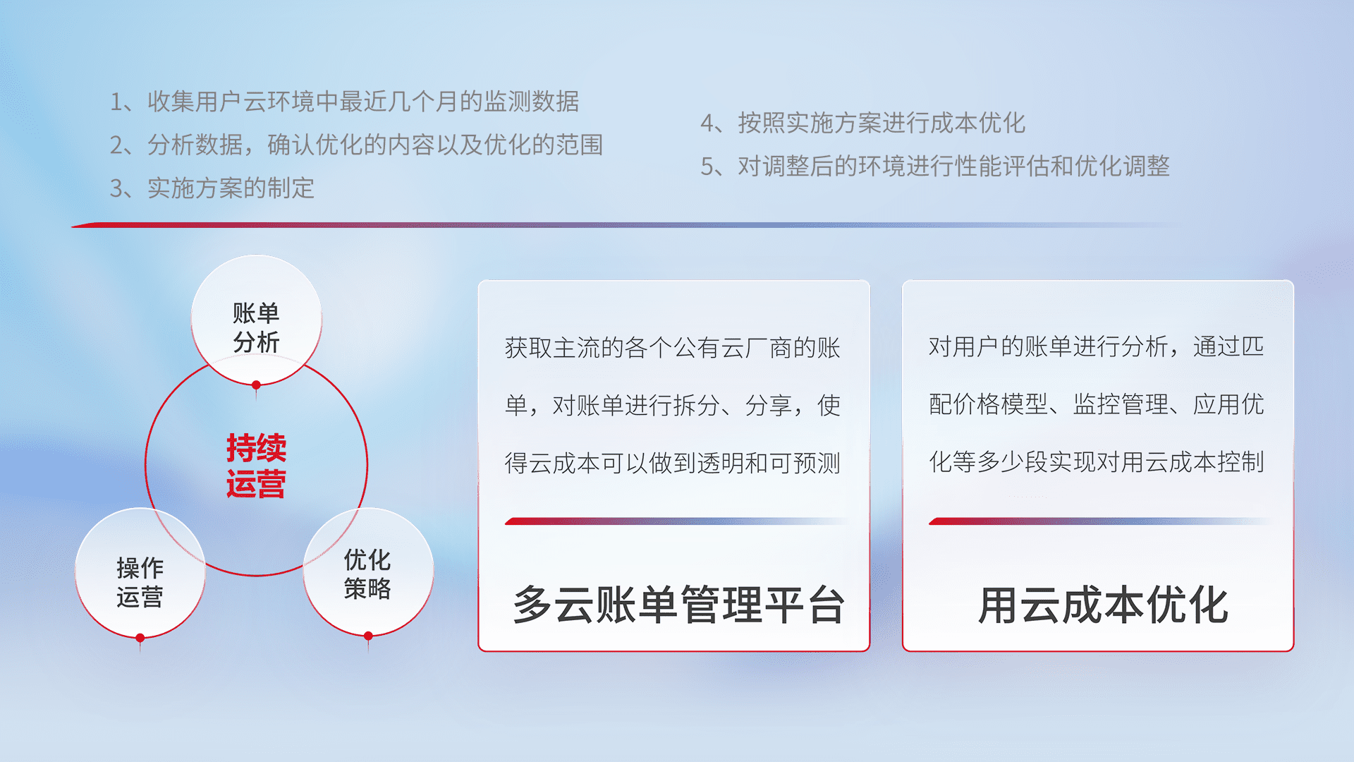 通过多云纳管,,,以统一的资源数据模型把客户的云资源进行抽象和封装,,,,进而实现对多云资源的统一操作,,保障云资源管理的可靠性、、、、稳定性与可用性。。。。量身定制化运维内容,,,,配置、、、、开发运维、、、补丁管理、、备份、、监控、、、、认证和访问管理、、审计和日常巡检等,,,,保障在用云过程中的可靠度,,,,稳定度以及高可用率。。。。