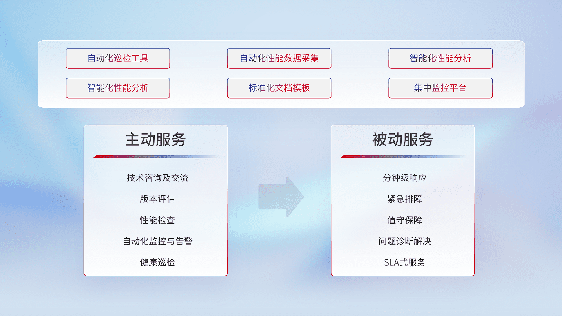 智能化工具和标准化文档,,,保障服务质量,,,提供主动服务(包含技术咨询、、、、版本评估、、、、性能检查、、、自动化监控与告警、、、健康巡检)和被动服务包含(分钟级响应、、、紧急排障、、、、值守保障、、、问题诊断解决、、、SLA服务)。。